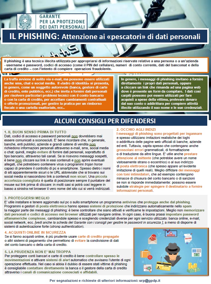 II phishing è uno stratagemma per indurre gli utenti a rivelare con l’ingannoinformazioni personali o finanziarie attraverso un’email o un sito Web, ma sempre più spesso anche tramite messaggi in arrivo da applicazioni molto usate come Whatsapp o Facebook. Indispensabile dunque adottare specifiche accortezze:Per saperne di più e rimanere sempre aggiornato: